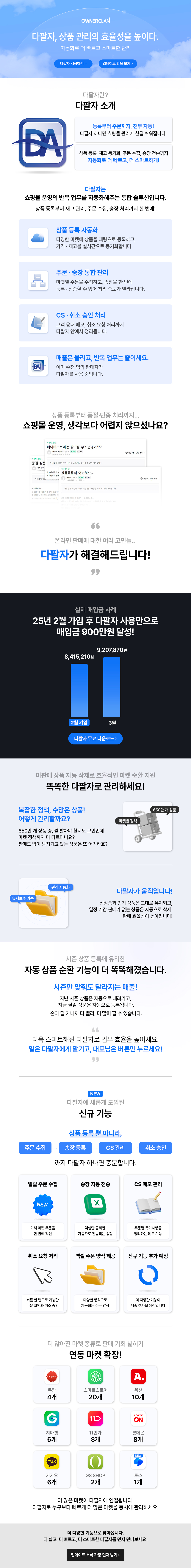 A: 네, 다팔자의 '상품 불러오기' 기능을 통해 마켓에 등록되어 있는 오너클랜 상품을 관리할 수 있습니다.